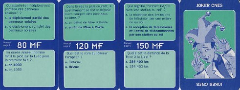 Sur les cases "questions" vous choisissez la catégorie "mise sur orbite" ou "espace"; si vous répondez juste vous gagnez la somme portée sur la carte; vous pouvez heureusement consulter le manuel fourni (le jeu est éducatif!) pour répondre mais perdez 40 MF sur la somme.