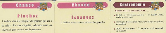 Certaines cases des parcours sont des cases "Chance" permettant de prendre un indice à un adversaire ou d'effectuer un échange, ou obligent à donner un de ses indices. Les cases "Gastronomie" obligent à répondre à une question ou à deviner à quelle région appartient un menu; la bonne réponse fait gagner un indice.