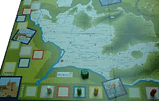 Le plateau représente, en périphérie, un parcours pour les pions, et, au centre, une belle carte de la région.