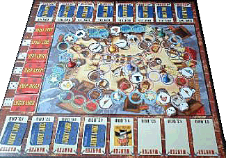 Le plateau représente un parcours, avec des barriques cachant les bandits, des cases avec explosifs, des raccourcis. Le pourtour du plan comporte les portraits des 16 hors-la-loi à capturer avec leurs mises à prix, de 1 000 à 16 000 $. Un emplacement pour 6 cartes "Evènements" est numéroté de 1 à 6, en relation avec les faces d'un dé.